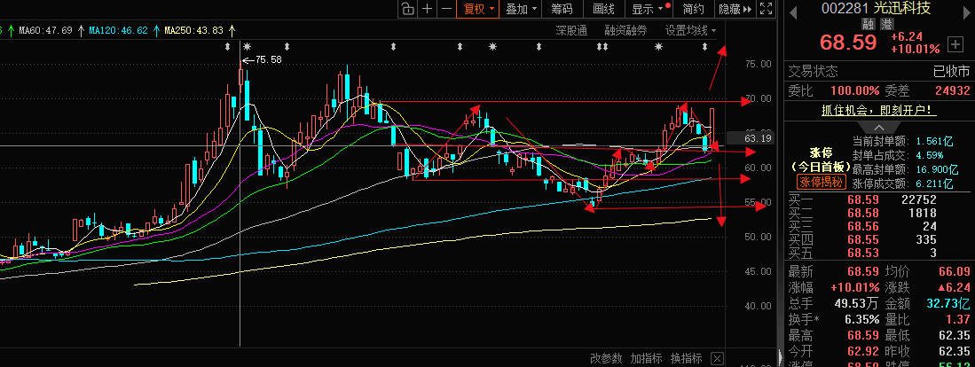 从技术面看,光迅短期趋势强势上涨,MACD指标多头行情延续,但股价已突破布林带上轨,短期存在技术性回调压力,上方压力位在70.05元附近,下方支撑位在54.53元附近。若股价能成功突破70.05元压力位,且成交量持续保持高位,后续有望继续上攻,若跌破54.53元支撑位,可能进一步下探。月线呈现波段上行,符合波段理论的要求,右侧交易还是看涨,若短期上冲释放68筹码,有望看到73块,持有个股或者已经在场的朋友可打在评论区解析后续走势,有合适买点大师兄会买入并子啊评论区提示,点个关注,给大师兄更新文章的动力。