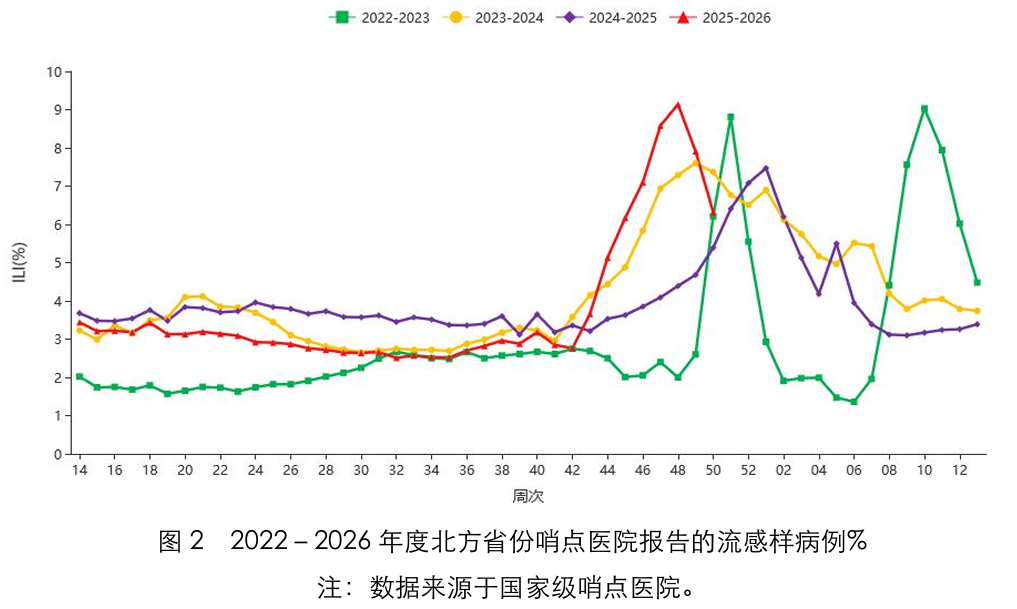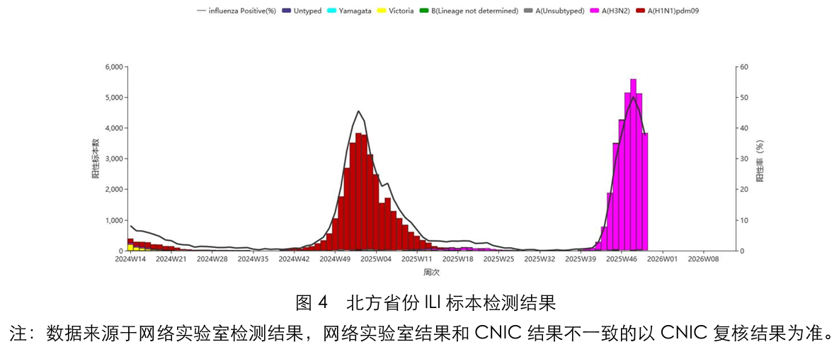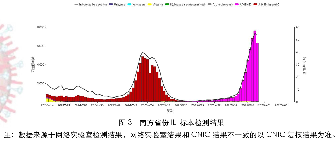 数据显示,南方省份哨点医院报告的流感样病例占门急诊病例总数的9.7%,较前一周的11.2%有所下降;北方省份该比例为6.3%,同样低于前一周的7.9%。当周全国共检测流感样病例标本21871份,其中阳性10096份,阳性率达46.2%。在所有阳性样本中,A型流感病毒占比高达99.6%。