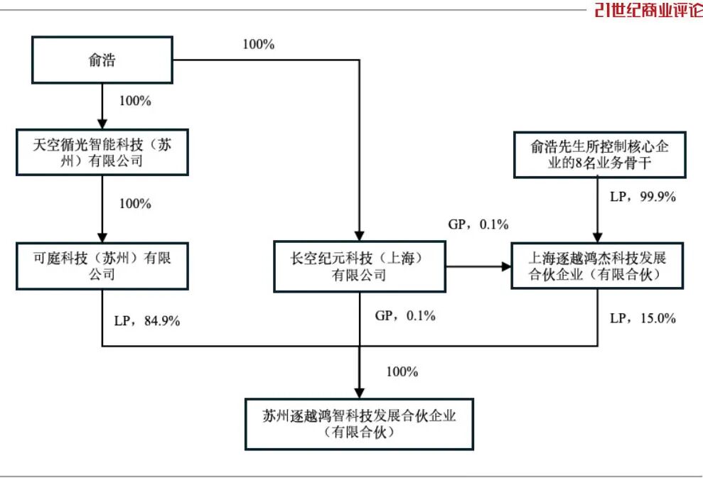 逐越鸿智控股股东是俞浩,持股85%,第二大股东则是“俞浩所控制核心企业的8名业务骨干”,持股15%。