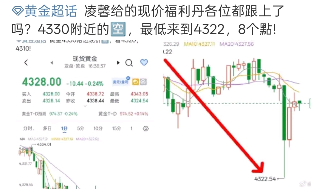 凌馨给的现价福利丹各位都跟上了吗?4330附近的,最低来到4322,兑现8个点!