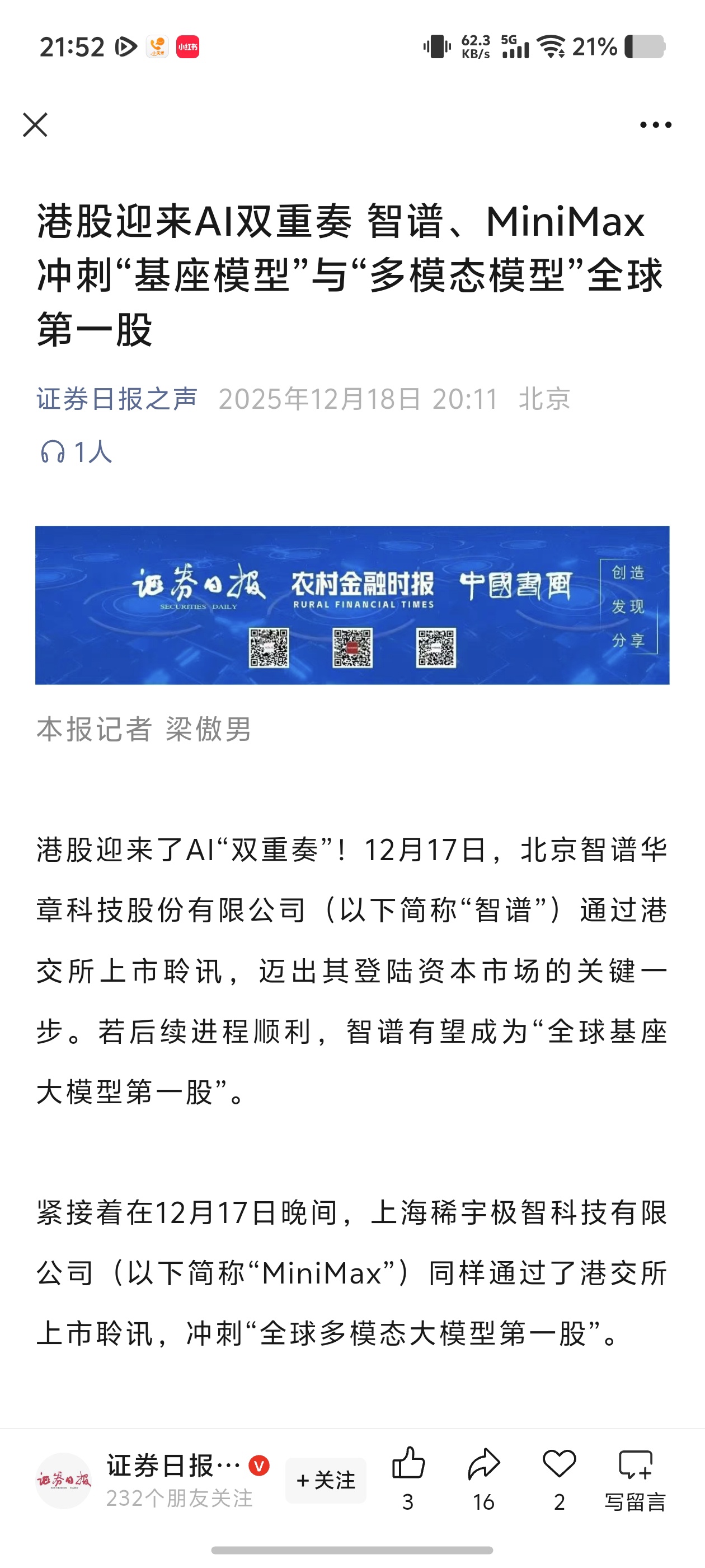 兄弟们,刚刚看到证券日报的重磅新闻,智谱AI和MiniMax双双通过港交所上市聆