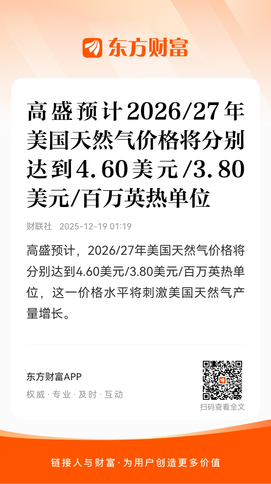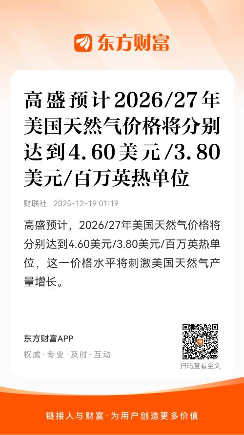 高盛预计,2026/27年美国天然气价格将分别达到4.60美元/3.80美元/百万英热单位,这一价格水平将刺激美国天然气产量增长。