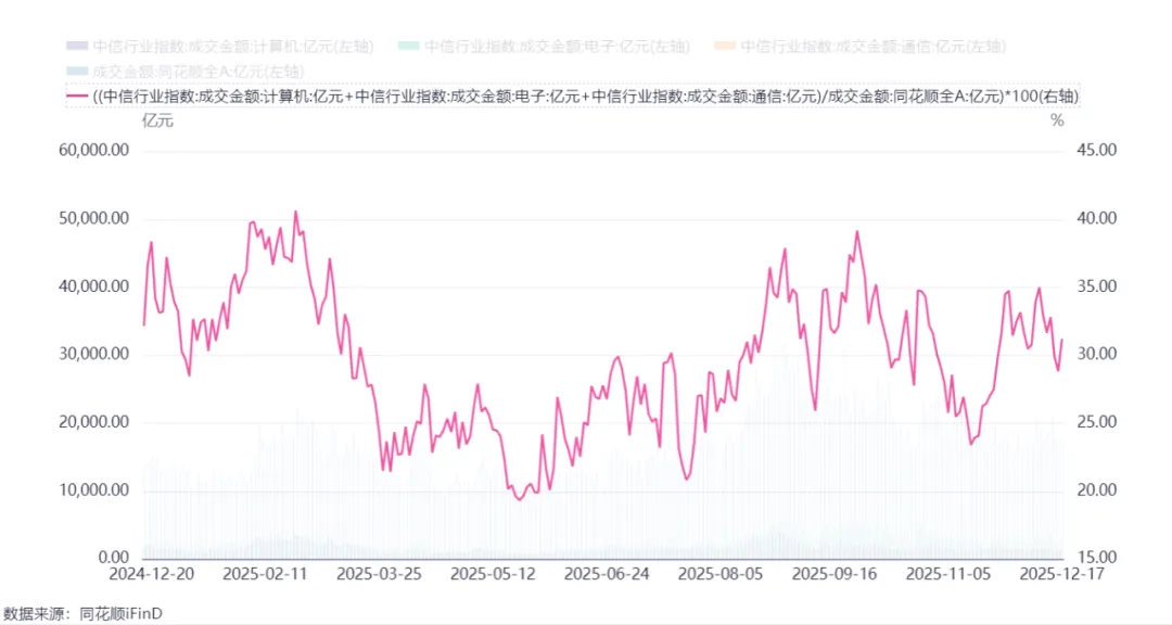 2025.12.17电子+计算机+通信成交额占全A的比例为31.2%,相比上个交易日上升了2.4%,近1年最高40.6%,4次阶段最高平均值为38.3%,下个阶段止盈目标为35%左右。