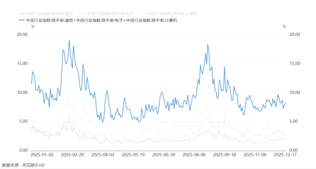 2025.12.17电子+计算机+通信换手率为8.3%,相比上个交易日上升了0.6%,近1年最高19.2%,4次阶段最高平均值为14.2%,下个阶段止盈目标为10%左右。