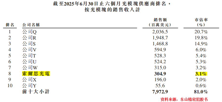 2024年,公司在全球光模块供应商排名中位列第八,市占率为2.5%;截至2025年上半年,公司在竞争激烈的市场中不仅维持住了排名,市占率还提升到了3.1%。