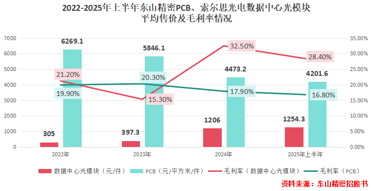 2022-2025年上半年,东山精密PCB产品整体均价逐年下滑,从6269.1元/平方米/件下滑到4201.6元/平方米/件;索尔思光电的数据中心光模块则与之形成鲜明对比,每件均价从305元激增到1254.3元。