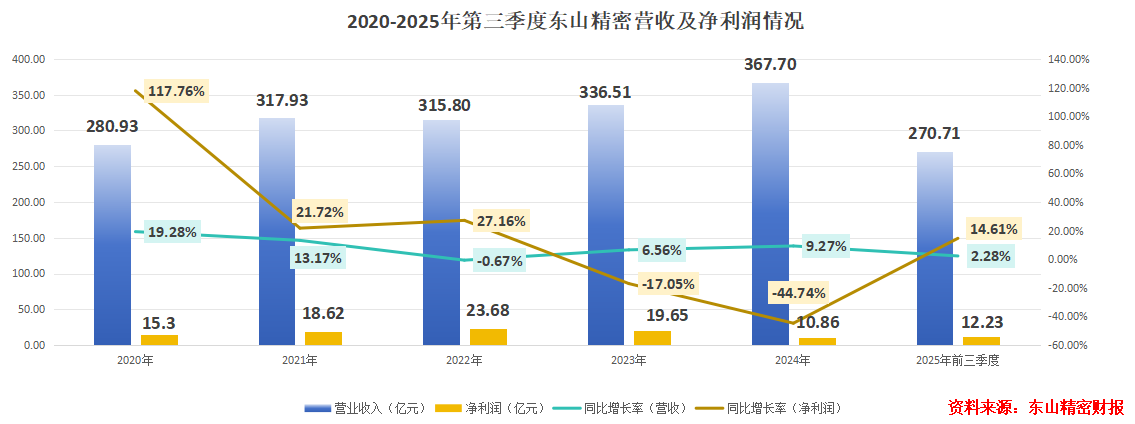 2025年前三季度,东山精密营收同比增长2.28%,为270.71亿元;净利润同比增长14.61%,达到12.23亿元。前两年公司净利润一直下滑,如今恢复增长,也为其资本布局增添了底气。