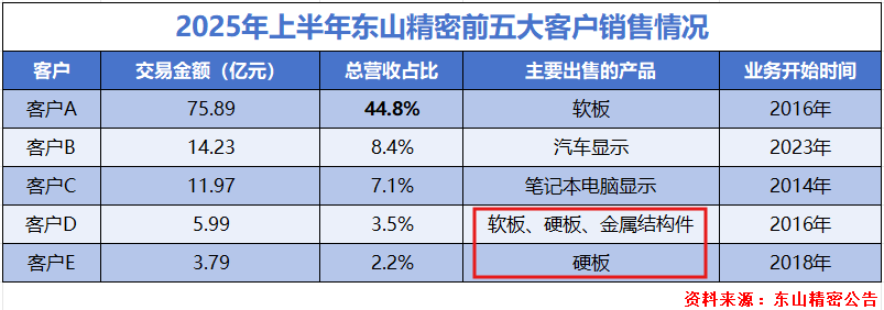 2025年上半年,东山精密前五大客户中,硬板产品只出现在第四、第五名客户的“主要出售产品”中,且这两大客户合计交易金额不足10亿元,合计总营收占比为5.7%。
