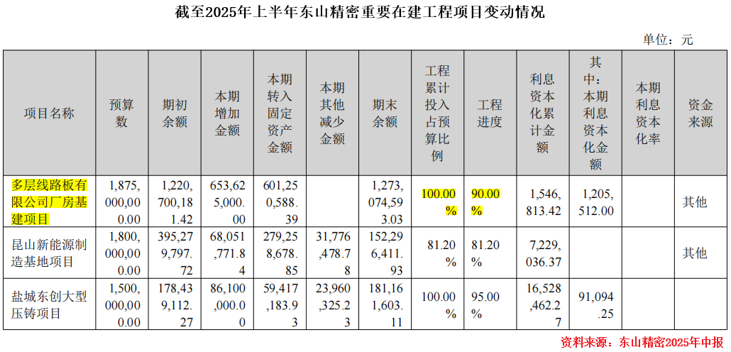 先是投资建厂房。早先公司拟投资18.75亿元建设多层线路板厂房,截至2025年上半年,该项目的“工程累计投入占预算比”已经达到100%,工程进度也达到了90%。