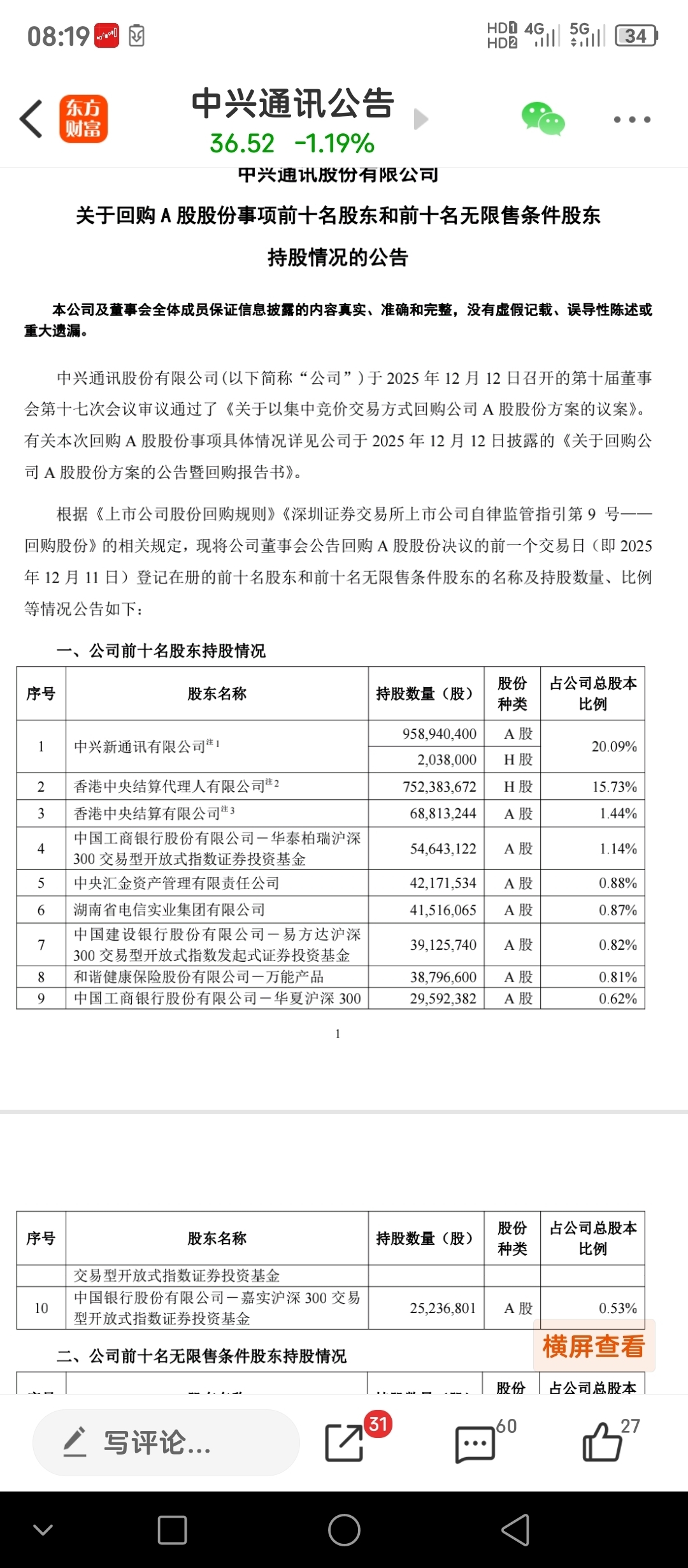 截止12-18日,前十大股东持股情况