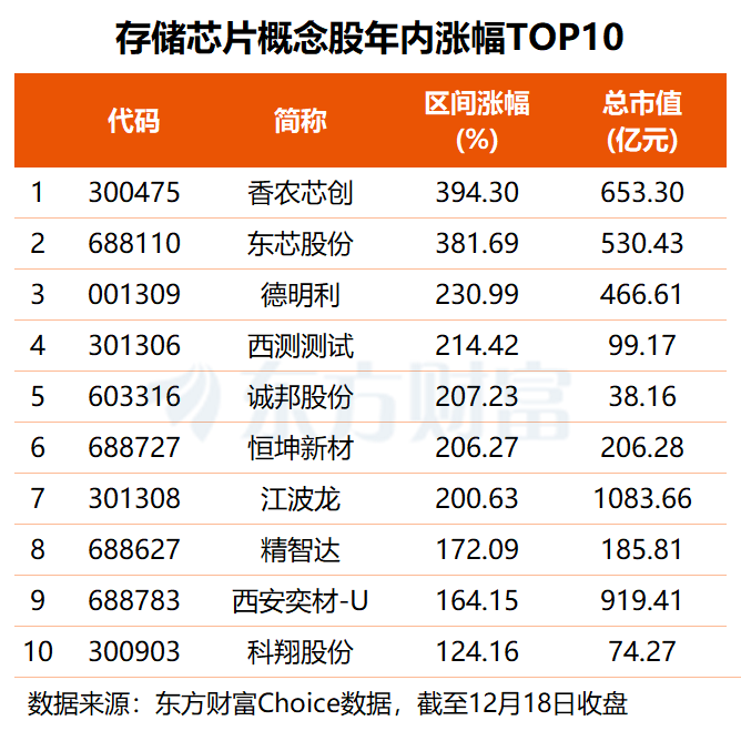 存储芯片板块指数今年累涨逾五成,近九成概念股实现股价上涨,平均涨幅约59.78%,更有18股翻倍式增长。其中,香农芯创年内大涨近4倍,东芯股份累涨3.81倍,德明利、西测测试、江波龙等5股年内涨幅均超200%。