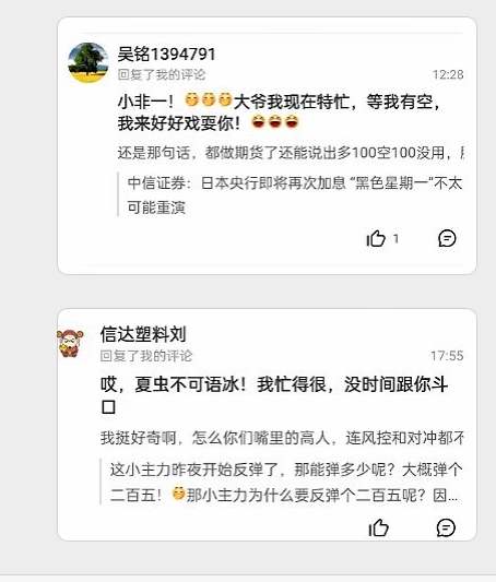 所以,大高人连风控和对冲都不懂呢?这高人也太高了吧?中某信的风控策略都不放在眼里,还能问出多100手空100手有什么意义这种话,好高的高人呐,大高人,您到底什么时候给我解释解释为什么中信开空单,又做多a股还能赚钱啊?您这么高的高人,一定能解释的了吧?用您嘴里那个,多100空100没意义?还是有风险就不做?哈哈哈哈哈哈哈