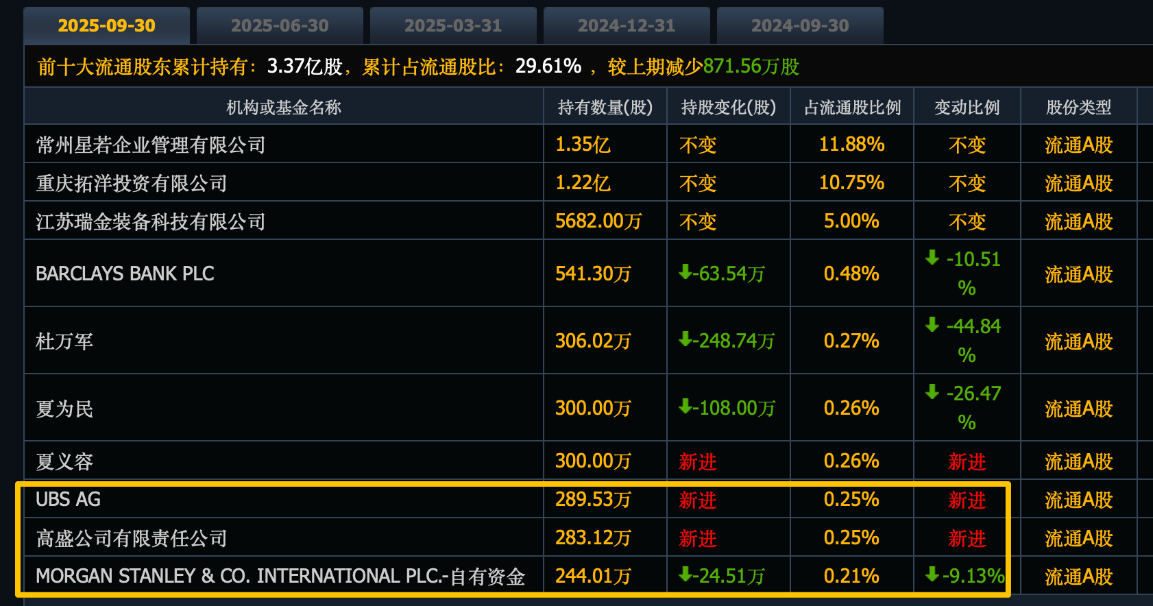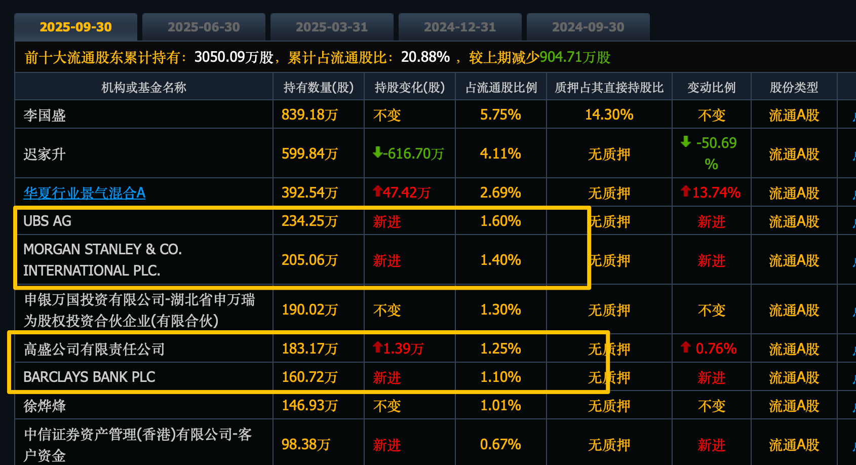 瑞银刚刚新进234万股,位列第四大股东;摩根士丹利新进205万股,位列第五大股东;