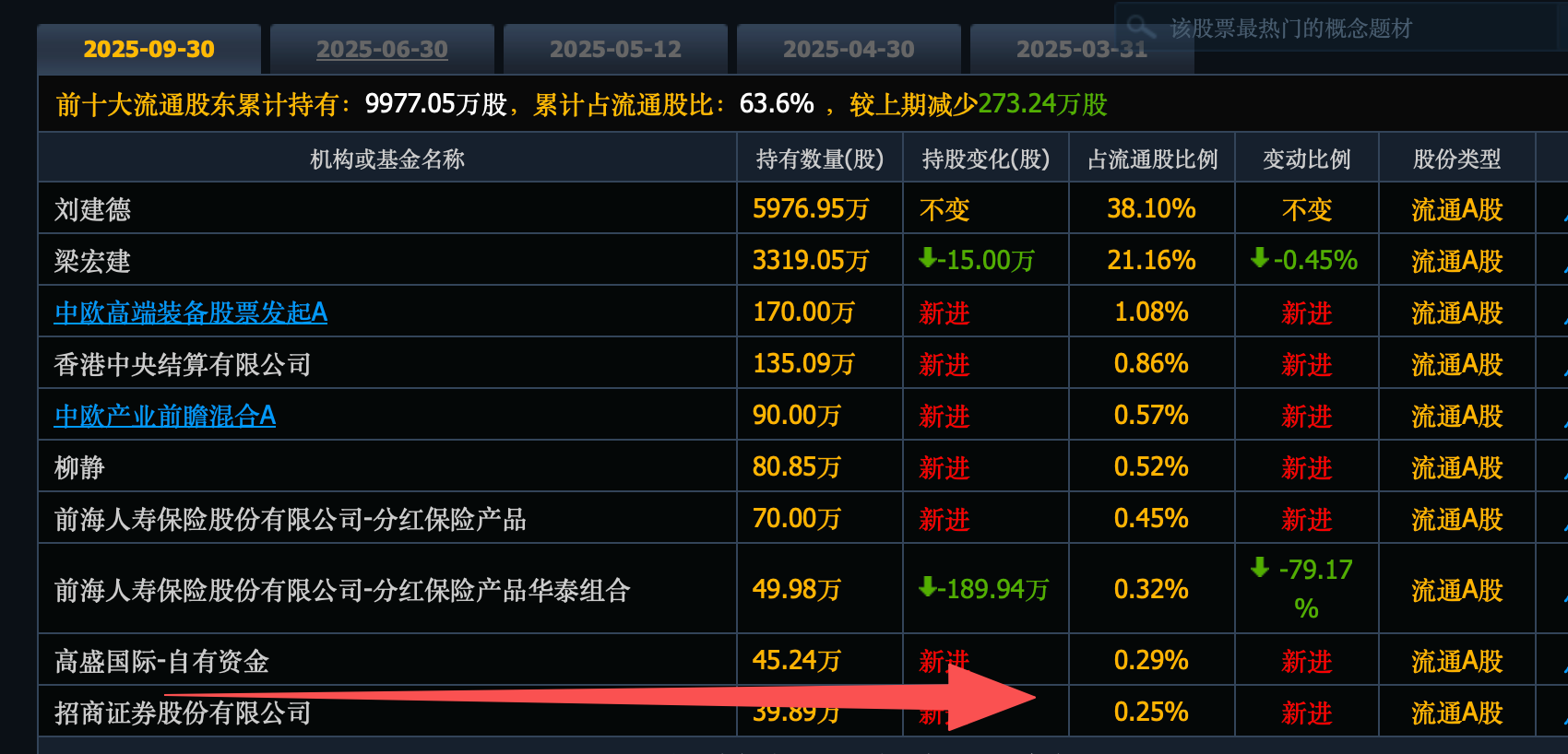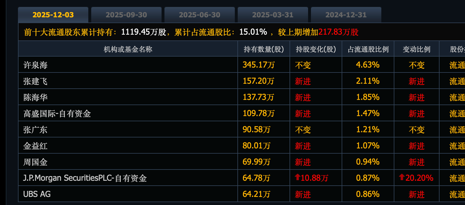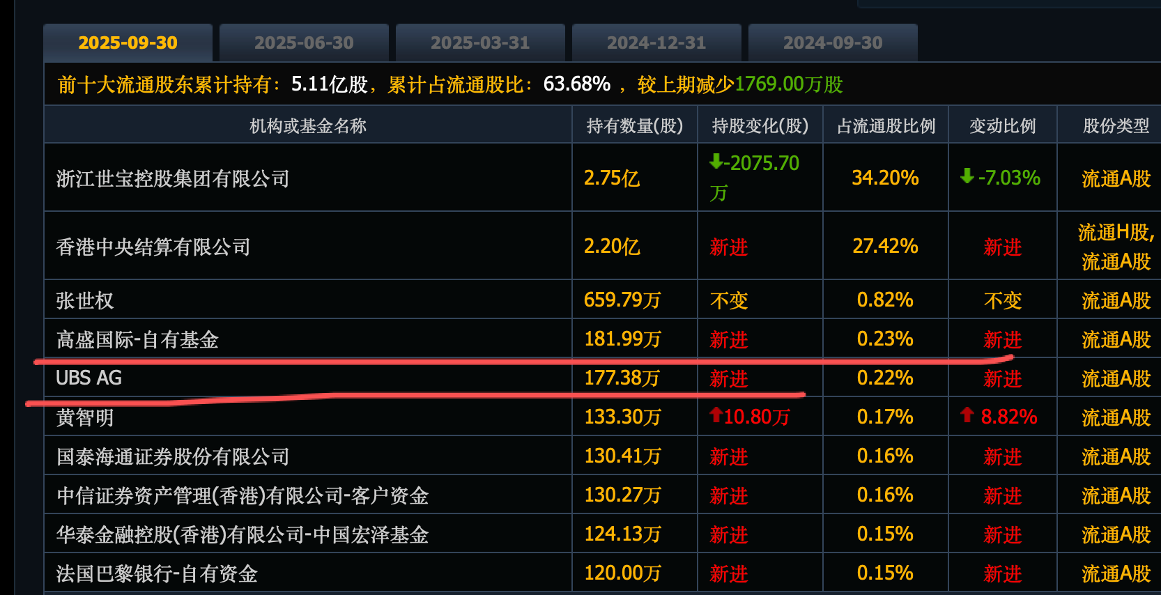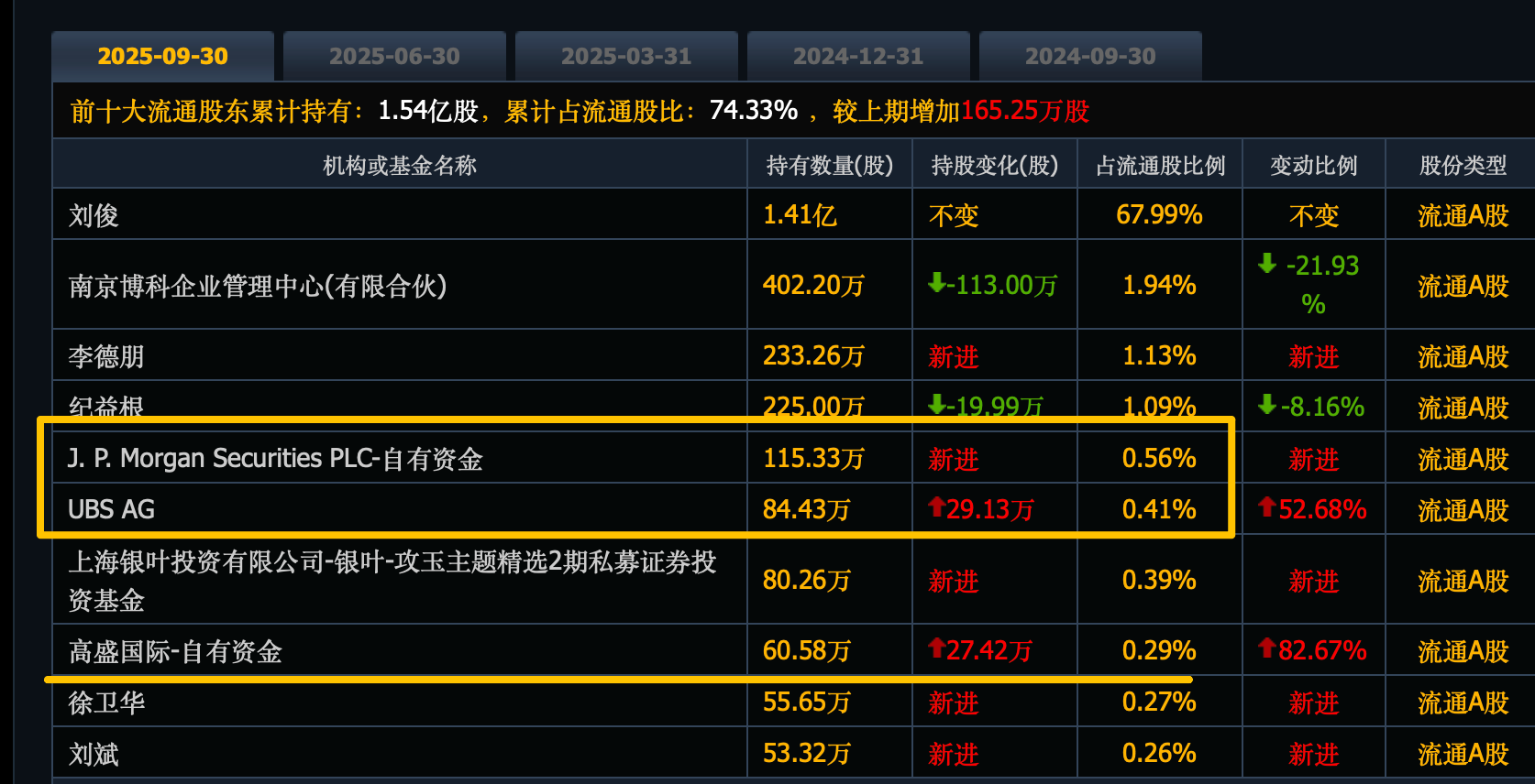 高盛刚刚新进283万股,位列第九大股东,瑞银刚刚新进入290万股,位列第八大股东。