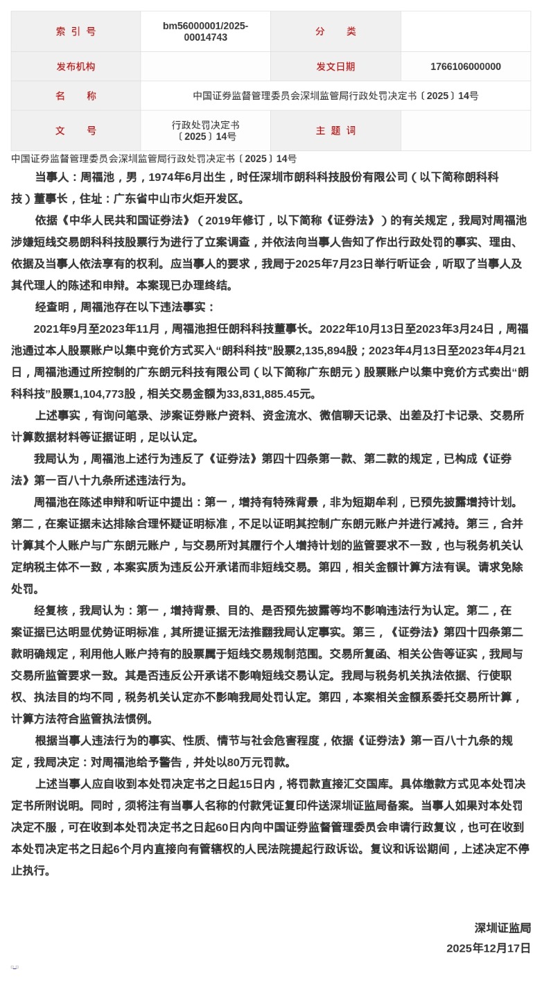蓝鲸新闻12月19日讯,近日,深圳证监局发布了行政处罚决定书,剑指时任深圳市朗科科技股份有限公司董事长周福池。