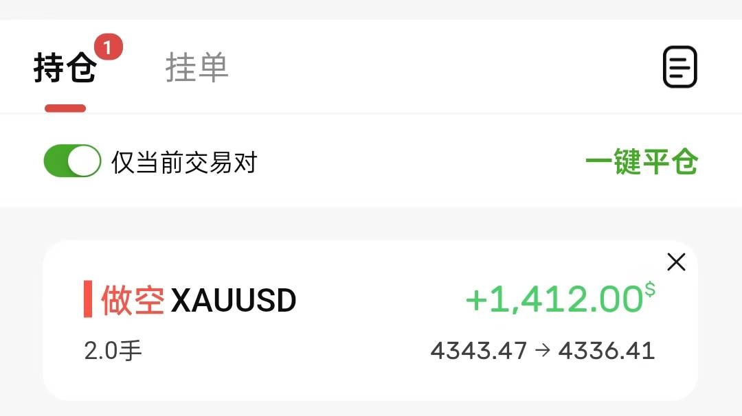 这是刚晚间黄金提示的空,于4343进场,小吃7个点,收米1412刀!