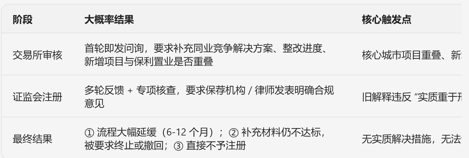 定性与事实不符:仍称 “无实质性同业竞争”,但 2023-2025 年双方在上海、广州等核心城市同场拿地、项目紧邻,住宅 + 商业开发高度重叠,具直接替代性,构成明确实质同业竞争。