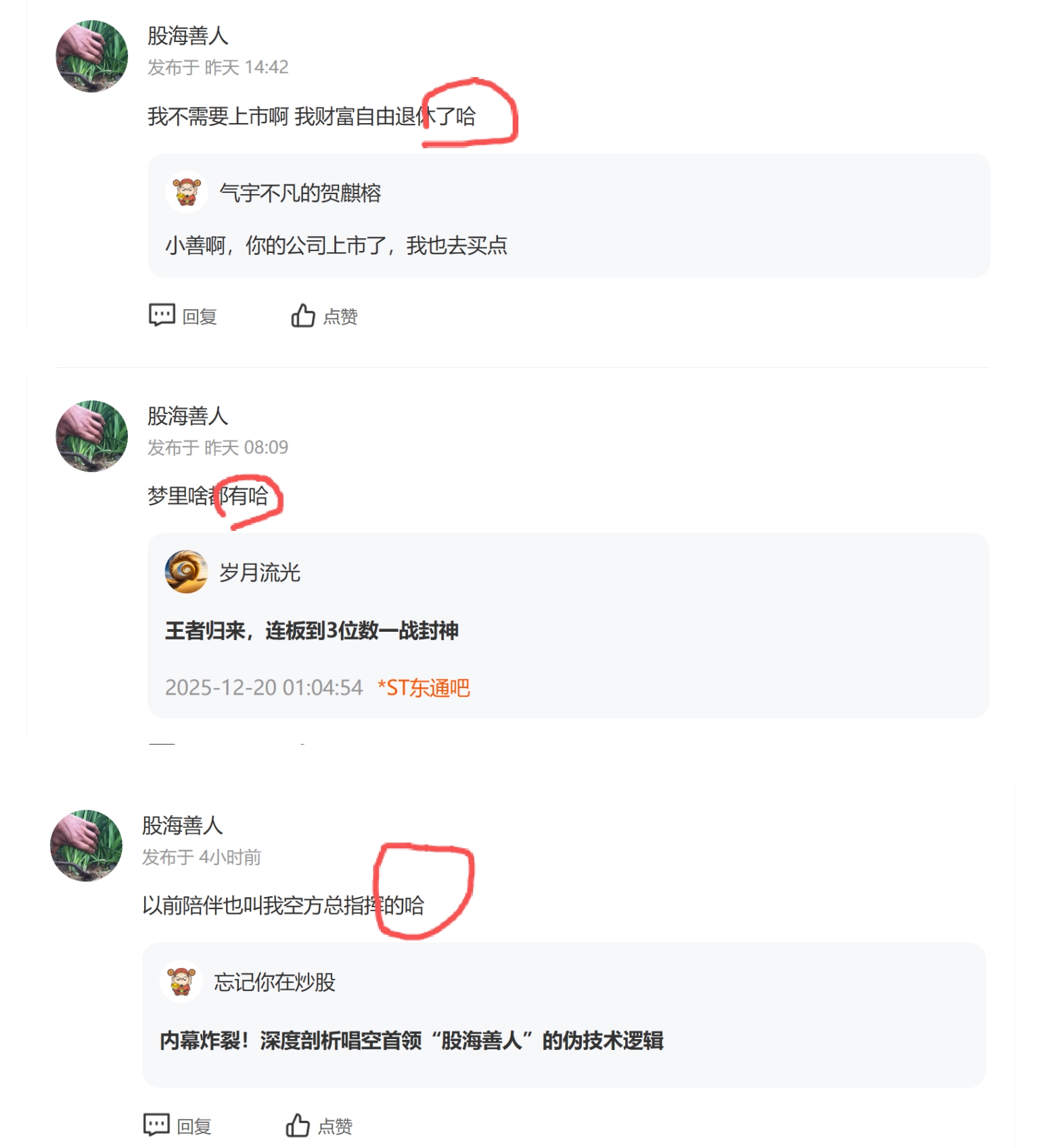 $*ST东通(SZ300379)$ 团。伙作.案,“股海善人”一人手搓3个号(ID:股海善人、地买天卖202209、纯真善良的潘飞文),每天熬夜至少到11点,早晨5点30起床开始打开在股吧工作!如此在3个号之前来回切换,并高频与股友互动打压信心,实在是忙的“不亦乐乎”,一般人真做不到啊。与之前建立的人设之“年龄50-60和黄老板同时期人物”、“实现财务自由”、“截图自己炒股轻松赚几百万”、“IT界资深技术男”(低级水平已在我上一篇帖子揭露!)、“东通前老板过去的风云内/幕”(因前期人设建立很成功,所谓内幕会有股友信以为真。爆料素材或真或假,均有专业团队编造提供)等等。。。
