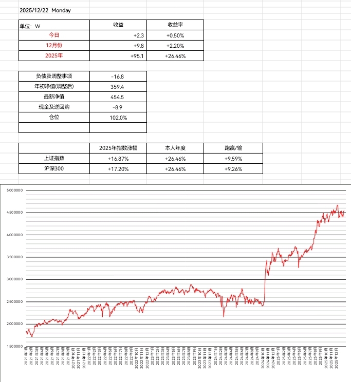 2025.12.22周一今日+2.3w(+0.5%)2025年+95.1w(+2