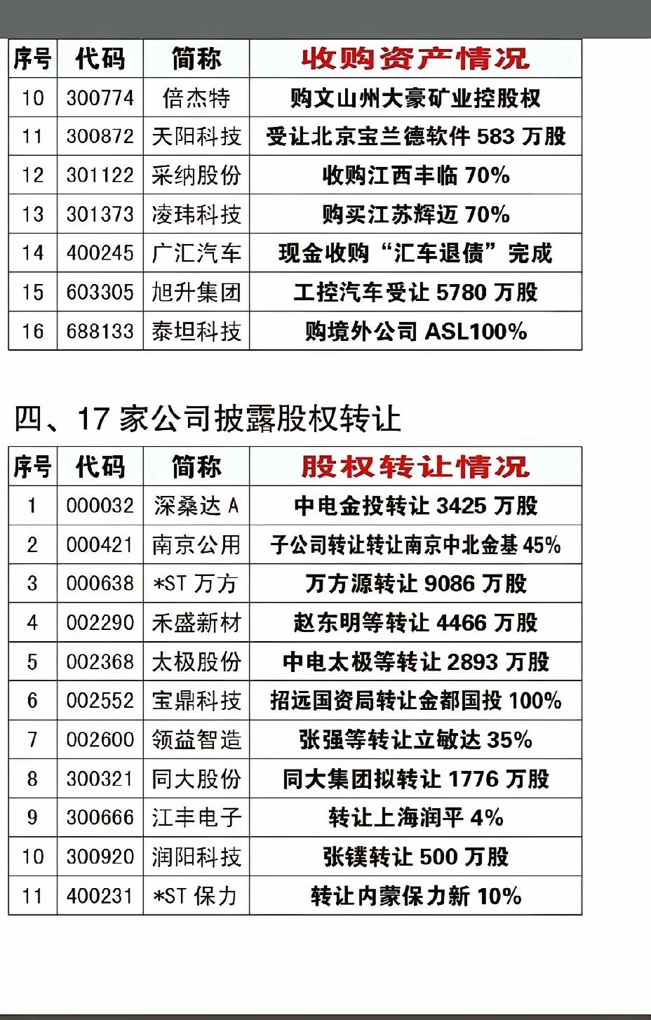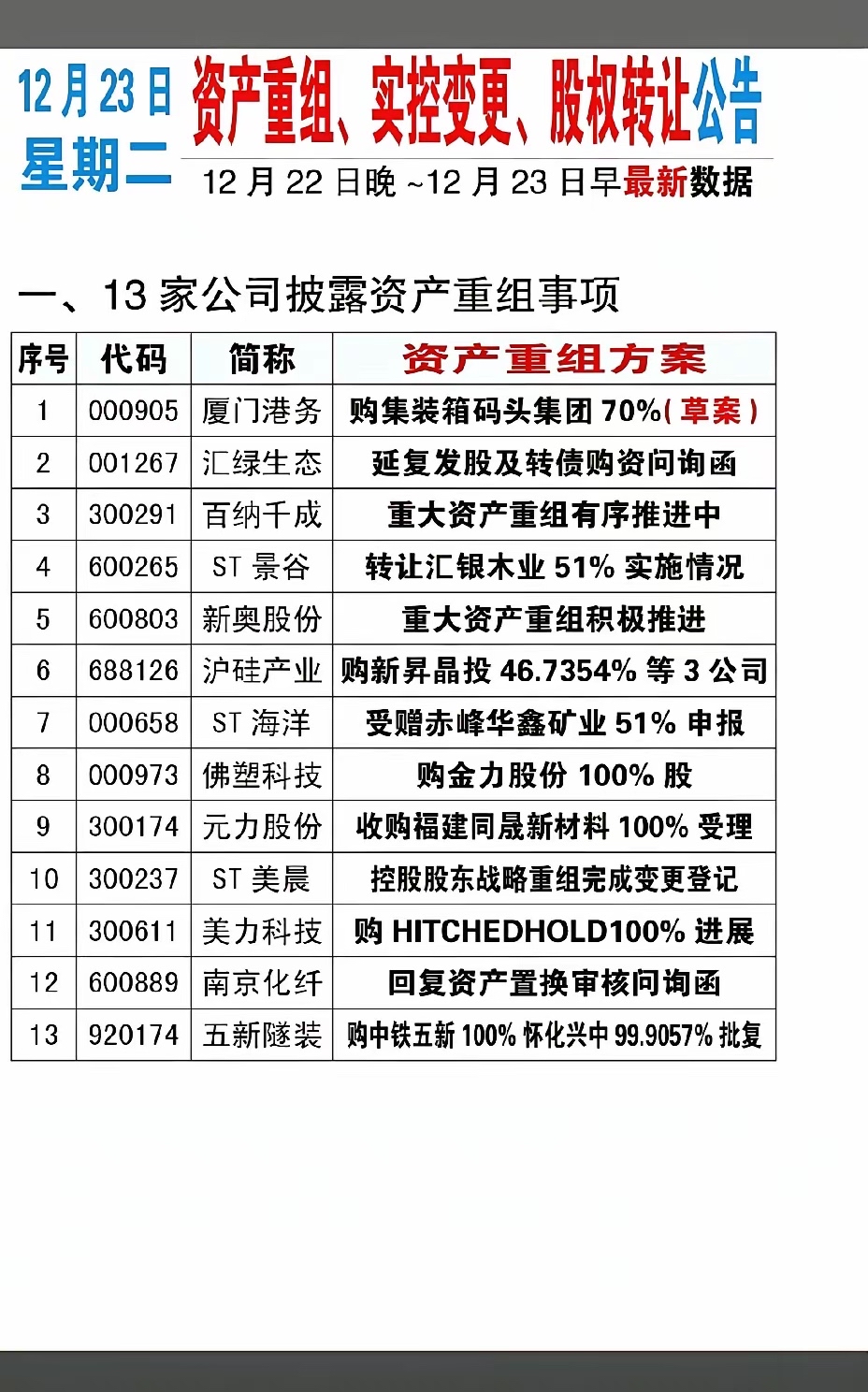13家公司披露资产重组事项,重点关注:佛塑科技购金力股份100%股,后市值得高看一眼;新奥股份重大资产重组积极推进,后市值得重点关注;7家公司披露实控人变更;16家公司披露收购资产;17家公司披露股权转让!!!
