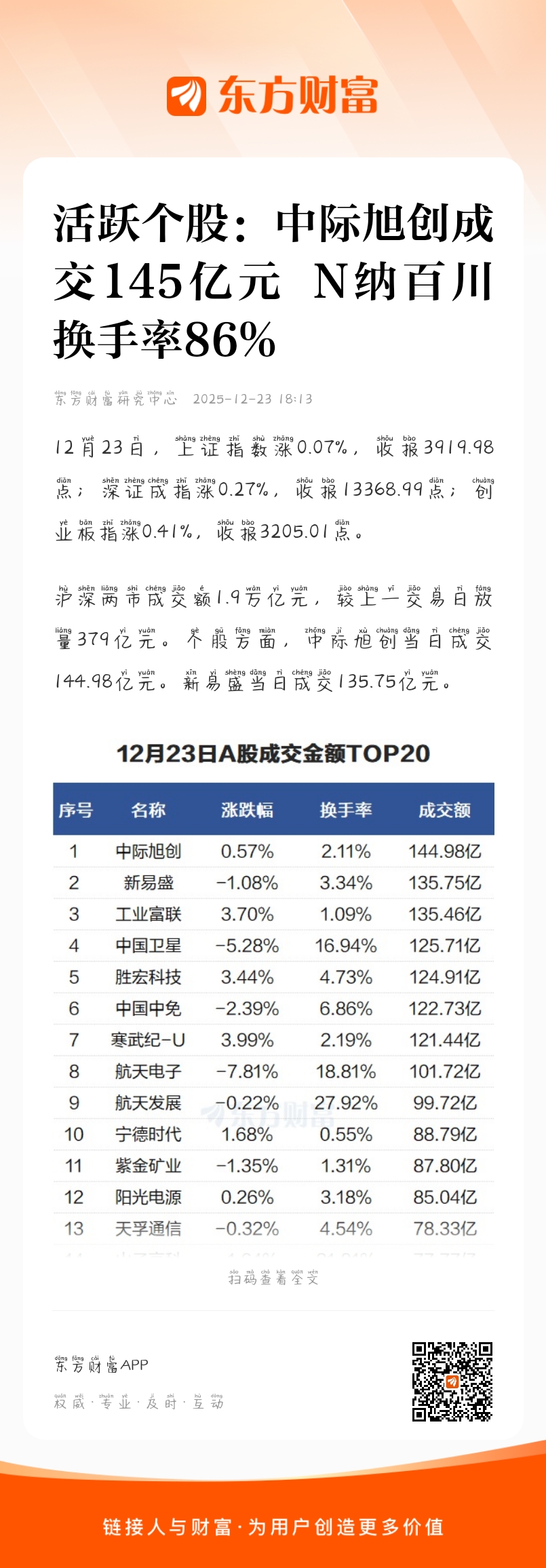 12月23日,上证指数涨0.07%,收报3919.98点;深证成指涨0.27%,收报13368.99点;创业板指涨0.41%,收报3205.01点。