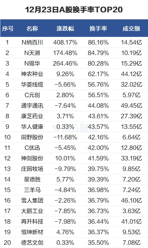 当天换手率最高的个股为N纳百川,全天换手率86.16%。N天溯紧随其后,全天换手率84.79%。