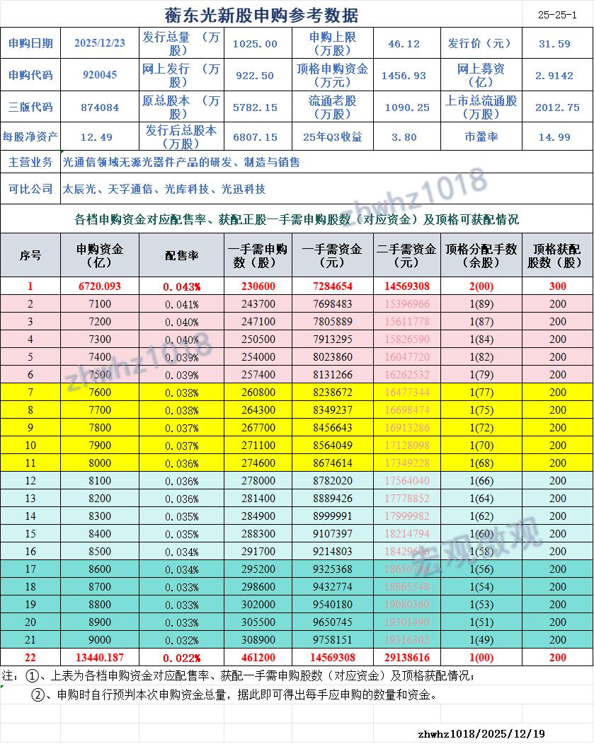 2025年第25只新股【蘅东光】(代码920045)在周二12/23开启网上申购,也是12月北市第2只新股申购,很大概率也是25年收尾的一只北交新股申购了。本次发行的【蘅东光】总部位于广东深圳市,主营业务为光通信领域无源光器件产品的研发、制造与销售。主要业务板块包括无源光纤布线、无源内连光器件及相关配套业务三大板块,具备生产出满足当前AI与ChatGPT快速发展带来的巨大算力需求的高精度、高集成度、高速率无源光器件产品的先进制造能力。本次发行总量:1025万股(原计划是1927.39万股,已大幅缩股),本次网上发行量:922.5万股(没有绿鞋,战投10%),发行价31.59元(原拟发行价约25.61),申购上限46.12W股,顶格资金1456.9308W。该股基本信息和《各档申购资金对应配售率、获配一手正股需申购股数/资金、顶格申购获配情况表》如下,供参与申购股友参考。