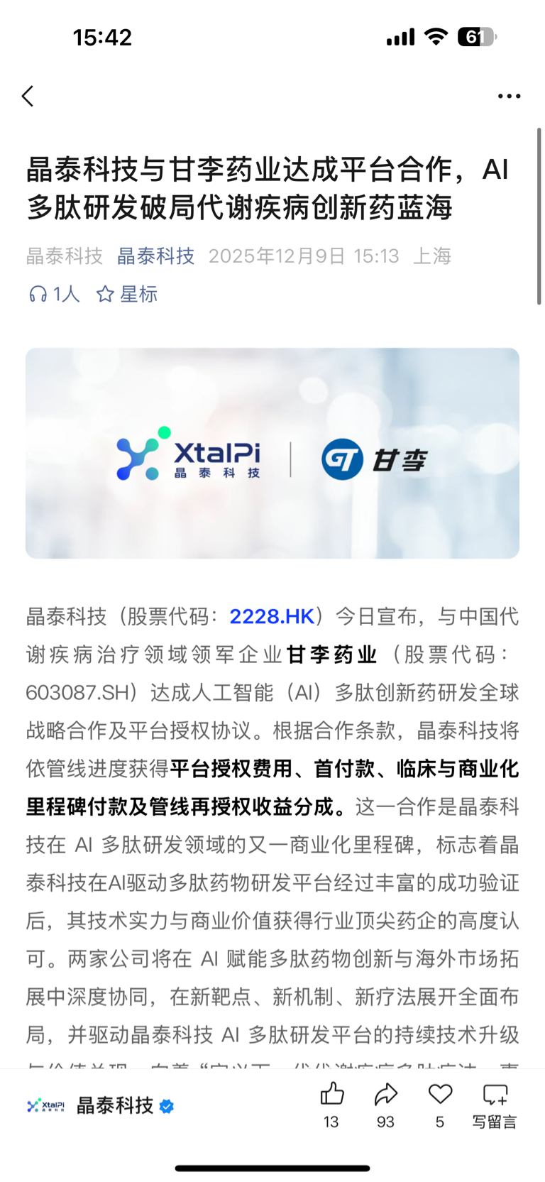 $晶泰控股(HK|02228)$ 晶泰科技与甘李药业达成平台合作,AI多肽研发破局代谢疾病创新药蓝海