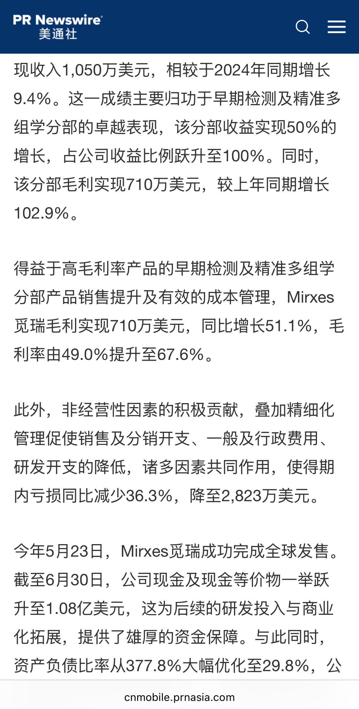 去搞晶泰这种前沿合作,没有点钱不行。觅瑞上半年收入1000多万美元,核心业务赚的钱暴涨50%,利润空间(毛利率)710万美元,较上年同期增长102.9%,口袋里还有超过1亿美金现金。