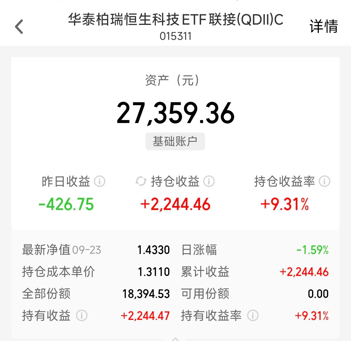 而港股市场基本面向好,从估值的角度看,指数还处于历史低位,成长空间大。又加上降息落地流动性宽松,是有利于港股估值修复,南下资金也是加速入场,所以从外资的角度看港市配置性价比更高。投资是要跟着趋势走,指数向上趋势明显,今日就继续定投分批买入,华泰柏瑞这只持仓以来体验佳,收益快十个点咯,弹性明显,又是一只七免基,做波段也合适。