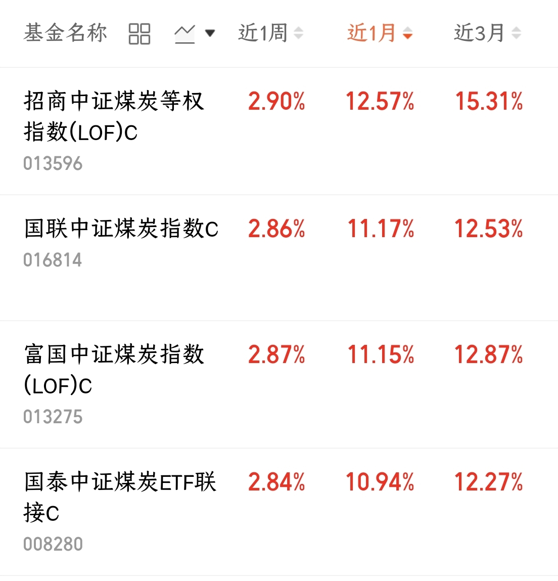 $招商中证煤炭等权指数(LOF)C(OTCFUND|013596)$近一月涨幅12.57%