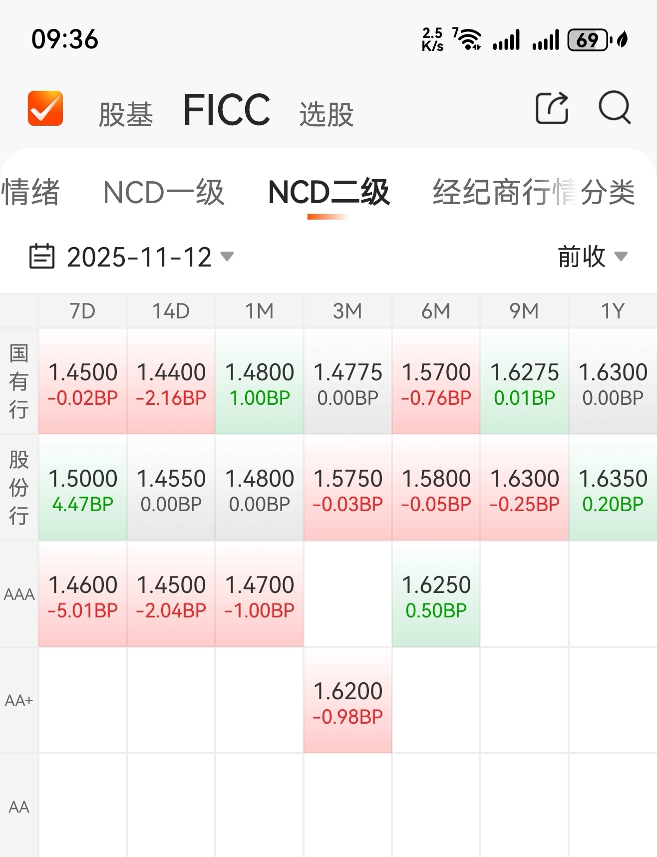 观察同业存单:10红、4平、5绿。(红色,是涨。绿色,是跌。)