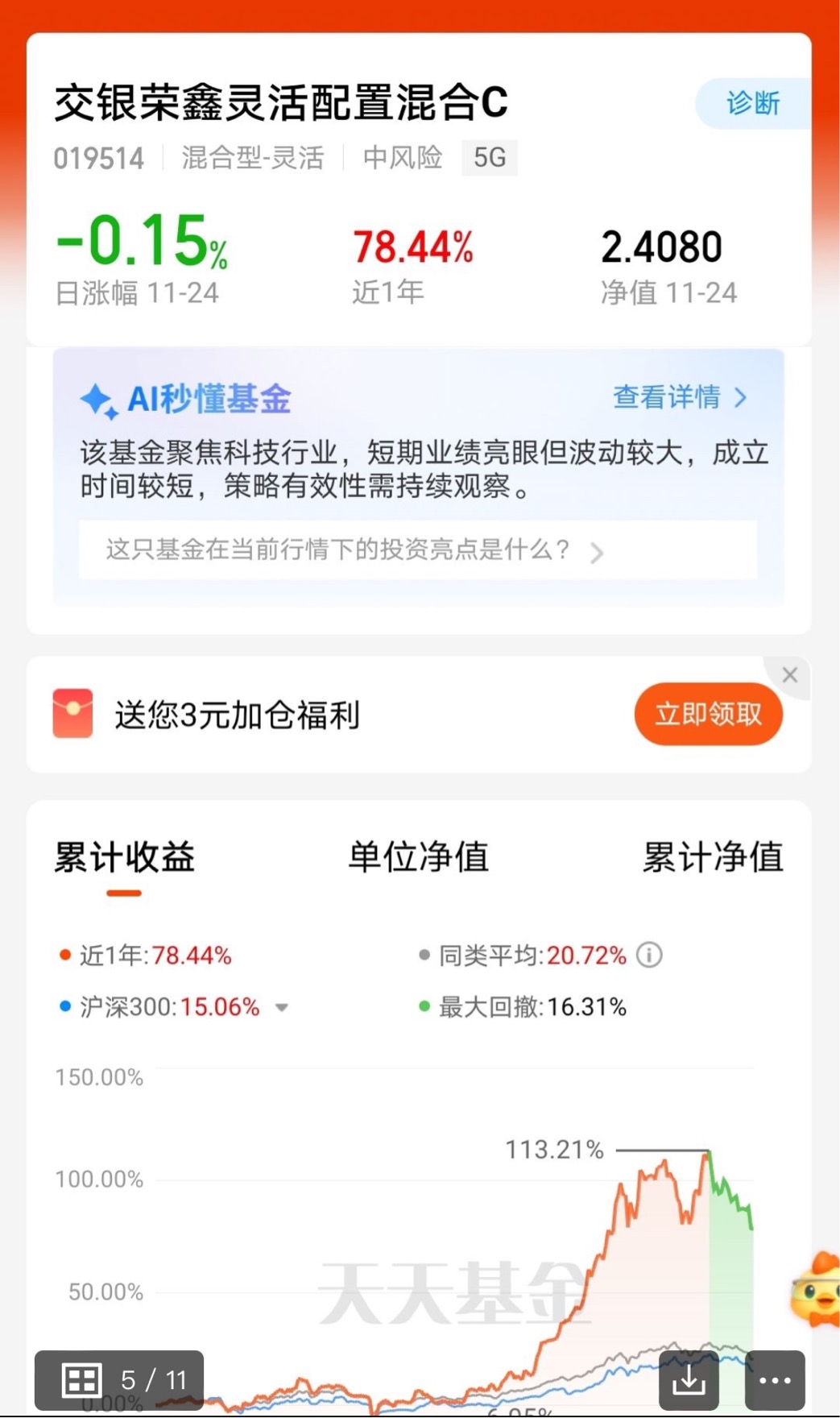 . 这基金近一年涨78.44%也太能打了!对比大盘和同类平均的表现,差距一下就拉开了。灵活混合的好处就是能追着好赛道跑,不用被动挨跌。看走势从去年到现在一路往上冲,现在持仓行业的势能还在,只要继续精准踩点,后续跑赢市场的希望很大。$永赢科技智选混合发起C$ $同泰产业升级混合C$ $交银优择回报灵活配置混合C$