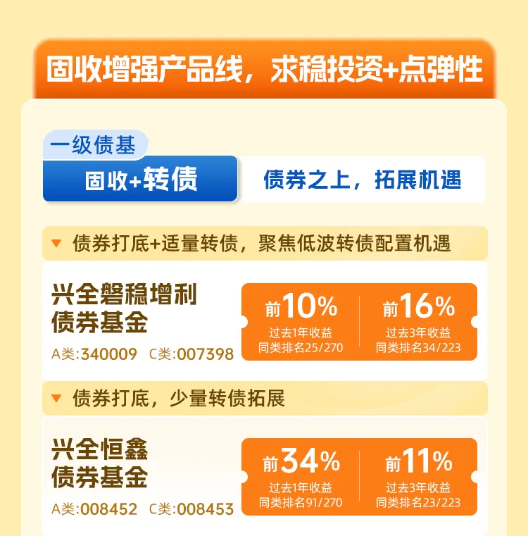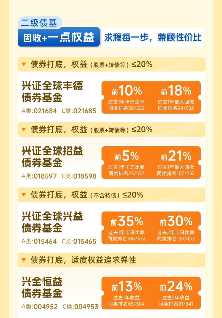 风险提示:指标的同类平均值、收益排名、波动率及排名、卡玛比率及排名、产品评级来源:银河证券,截至2025/10/31,兴全恒鑫债券(A类)、兴全磐稳增利债券(A类)同类为3.2.1 普通债券型基金(可投转债)(A类);兴证全球招益债券(A类)、兴证全球兴益债券(A类)、兴证全球丰德债券(A类)、兴全恒益债券(A类),同类为3.2.3 普通债券型基金(二级)(A类);兴证全球兴晨六个月持有期混合(A类)同类为2.5.1 标准偏债型基金(股票上下限10%-30%)(A类) ;兴全汇享一年持有期混合(A类)同类为2.5.5 普通偏债型基金(股票上限高于30%)(A类);兴全汇吉一年持有期混合(A类) 同类为2.4.1股债平衡型基金(A类);兴全汇虹一年持有期混合(A类) 同类为2.5.5 普通偏债型基金(股票上限高于30%)(A类);兴证全球兴裕混合(A类) 同类为2.5.5 普通偏债型基金(股票上限高于30%)(A类)。收益排名采用净值增长率衡量,波动率排名采用标准差衡量,卡玛比率计算公式=年化净值增长率/最大回撤,最大回撤取绝对值。卡玛比率衡量承担每单位回撤所能获得的收益,指标越高,意味着投资的性价比更好。