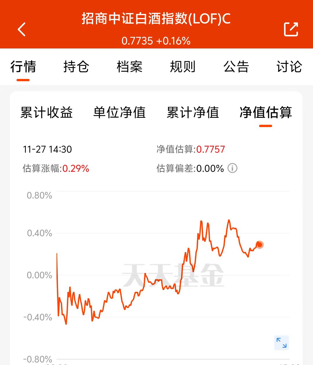 大盘今天继续上涨,消费板块表现还不错,白酒今天涨起来了,午后持续拉升,$招商中证白酒指数(LOF)C(OTCFUND|012414)$目前预估涨幅0.29%,消费板块发展前景还不错,春节白酒应该会有一波行情,长期看好这个方向,我准备继续定投加仓了!
