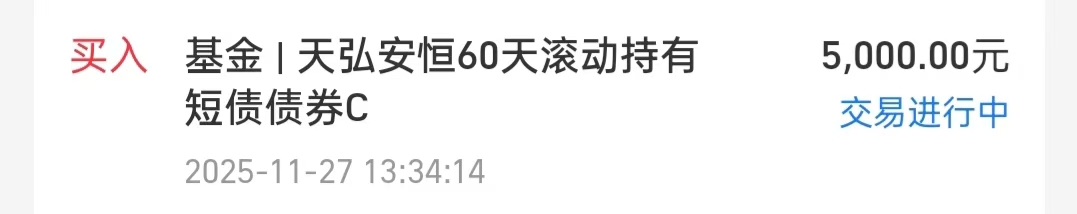 $天弘安恒60天滚动持有短债C(OTCFUND|016160)$,+5000元。