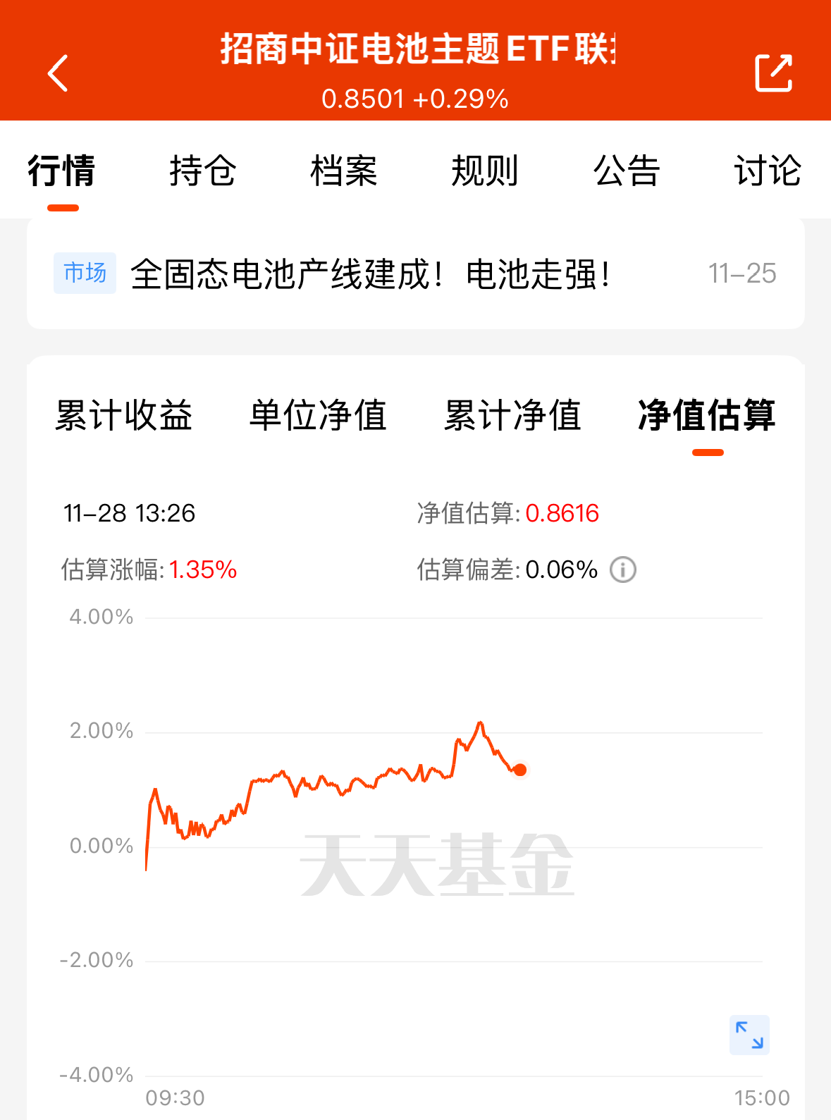 宝子们下午好啊!今天电池板块相当给力!$招商中证电池主题ETF联接C(OTCFUND|016020)$深v拉升,到现在估值+1.35%,电池级碳酸锂价格大涨,宁德时代签200GWh十年大单,国内首条大容量全固态电池产线投产。有这么多利好支撑,而且都是实打实的,目前保持看好态度,别把我洗出去了。
