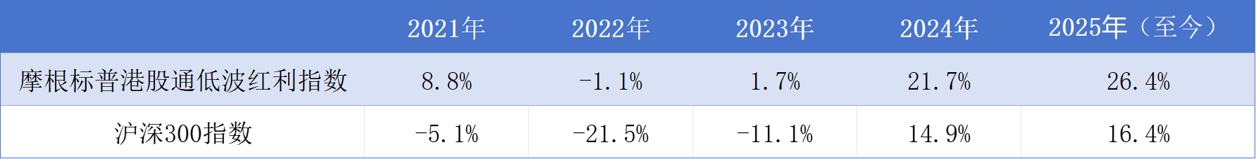 那么在这样的市场环境下,股息率高达6%以上的港股红利资产性价比凸显,成为资金追逐的焦点。与A股红利指数相比,港股红利指数具有明显优势。标普港股通低波红利指数近一年涨幅约28%,大幅超越中证红利指数和中证红利低波动指数的10%。从历史表现看,该指数近三年净值增长率达到75%,连续四年跑赢沪深300指数,在2021-2023年的熊市期间,两个年度逆势取得正收益,抗风险能力突出。