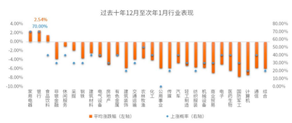 历史数据来看,红利板块确实在年底占据一定优势。回顾2015年12月以来,过去十年12月至次年1月的申万一级行业的涨跌幅,家电,银行板块等传统红利板块无论是在平均涨跌幅,还是上涨概率这两方面都占据一定优势。单就银行来看,平均涨跌幅达到了2.54%,上涨概率也有70%以上,可以说上涨的确定性还是很高的。