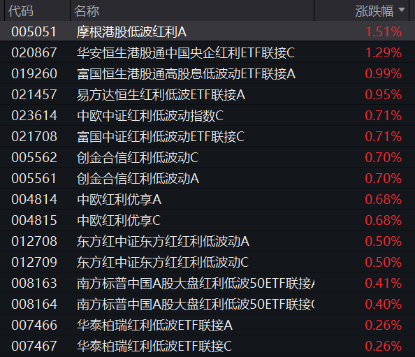 所以,还没配置这个方向的,可以看看摩根标普港股通低波红利指数A(005051)这个布局港股红利的产品,这基单位净值也创历史新高,目前已经8连涨了,今天又是大涨1.51%,领跑主流红利基产品。