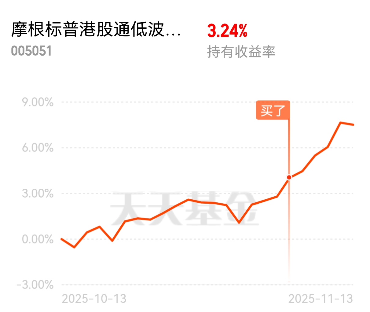 $摩根标普港股通低波红利指数A$这只最近买入的,走势震荡上行,目前盈利3.24%