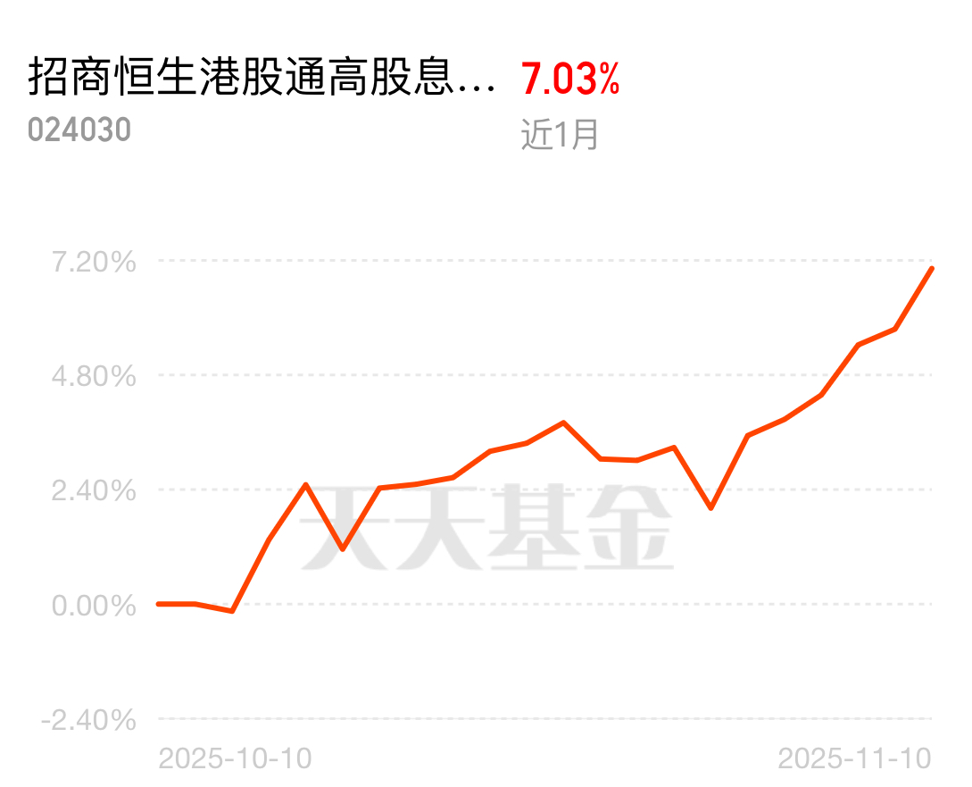 港股市场慢慢走出低谷,红利板块率先发力,招商恒生港股通高股息低波动ETF联接C昨日涨幅1.20%,紧跟行情节奏,近1个月涨了7.03%,既能享估值修复又能拿分红,一举两得。