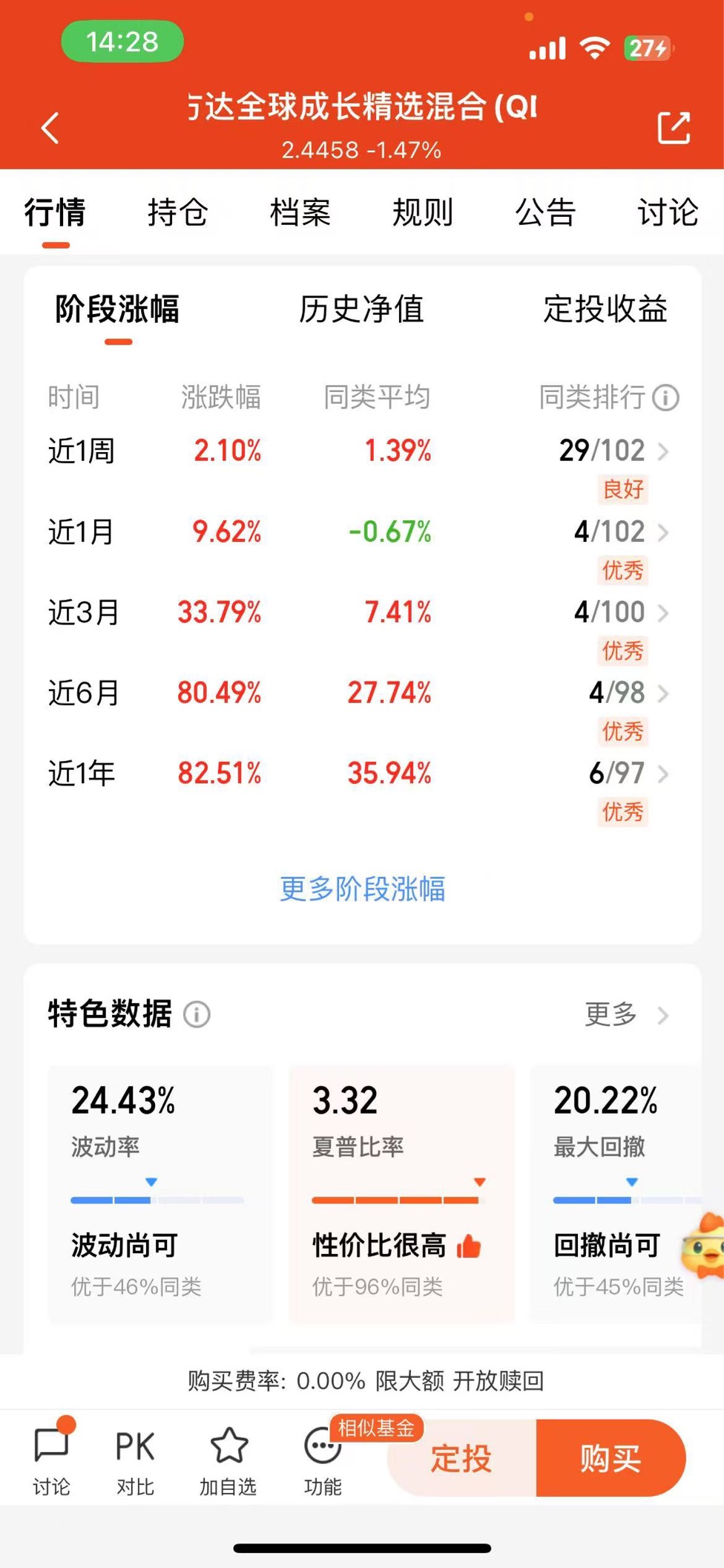 最近行情反复横跳,太考验心态了!但我挖到了“定心丸”——易方达全球成长精选混合,常年霸榜绩优低回撤第一,走势稳中有升超靠谱。它的核心亮点是全球配置,A股、港股、美股均有布局,有效规避单一市场风险,而且基金经理调仓能力超强,科技赛道每波涨幅都能牢牢抓住,不管是一季度港股修复,还是二季度AI、A股科技风口,都精准踩中,长期拿下去绝对香!