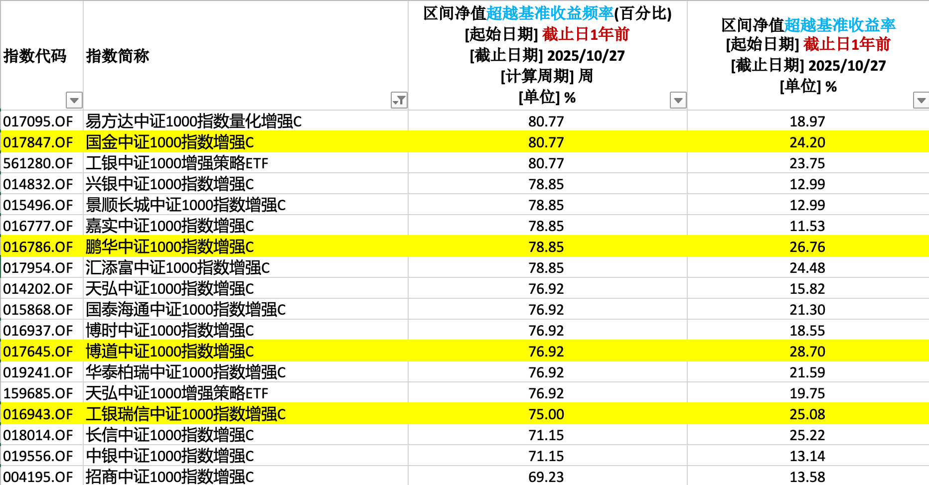 近1年国金中证1000指数增强C,超越基准收益频率(周)为80.77%,超越基准收益率为24.20%;鹏华中证1000指数增强C,超越基准收益频率(周)为78.85%,超越基准收益率为26.76%;博道中证1000指数增强C,超越基准收益频率(周)为76.92%,超越基准收益率为28.70%;工银瑞信中证1000指数增强C,超越基准收益频率(周)为75%,超越基准收益率为25.08%。