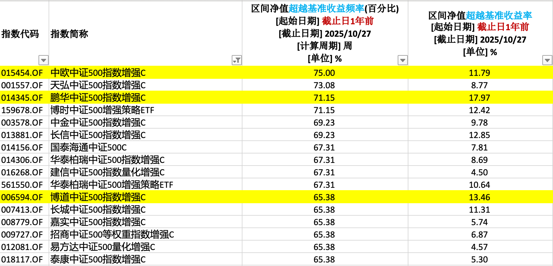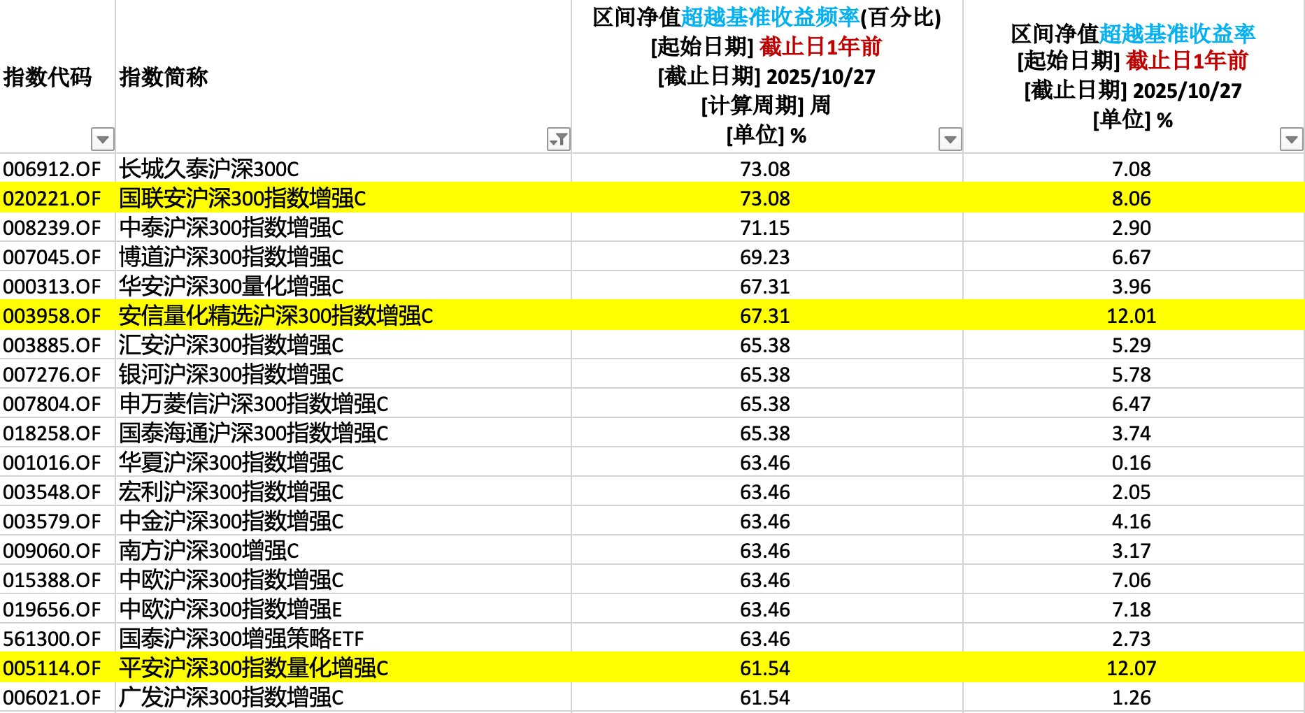 如下图标注黄色的产品,近1年国联安沪深300指数增强C,超越基准收益频率(周)为73.08%,超越基准收益率为8.06%;安信量化精选沪深300指数C,超越基准收益频率(周)为67.31%,超越基准收益率为12.01%;平安沪深300指数量化增强C,超越基准收益频率(周)为61.54%,超越基准收益率为12.07%。