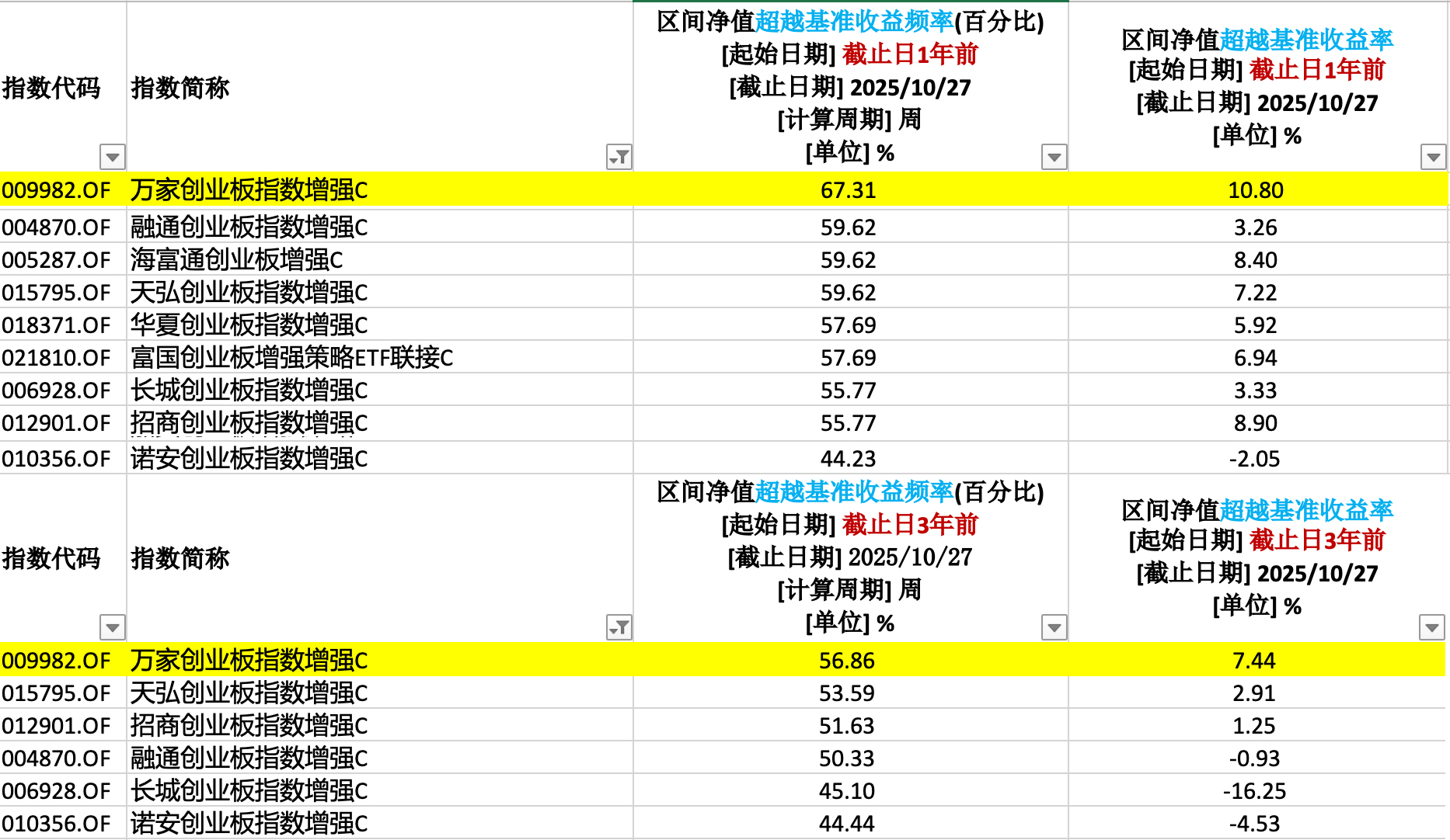 挑选创业板指增就简单多了,没啥特别纠结的。如下图数据,万家创业板指数增强C近1年和近3年表现,不管是超越基准收益频率(周),还是超越基准收益率,在同类中都名列前茅。