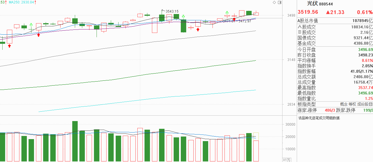 !老铁们!把目光都给我聚焦过来!光伏昨天小阴调整回踩5天线,今天小阳反弹一度反包昨天失地,现在冲高回落出现上影线。由于光伏自9月5号大阳线后横向震荡两个月,属于震荡市而不是上升趋势,上影线代表阻力,如果今天尾盘无法收复,下周光伏就有可能向下再探支撑了。从细分赛道看,今天机器人表现较强,储能也不错,但光伏产业、风电基本没动,属于没有合力的一天,今天冲高回落是条件没达到,多空分歧大下周再确认支撑后可能更容易走强。从光伏行业走势看,20天线、10天线离现在也不远,主要得益于这两个月的波动比较窄,我认为探底力度也不会太强,没有必要因为今天有上影线就担心下周像半导体、通信那样的大幅回撤,找到主力资金的流入方向才是核心!