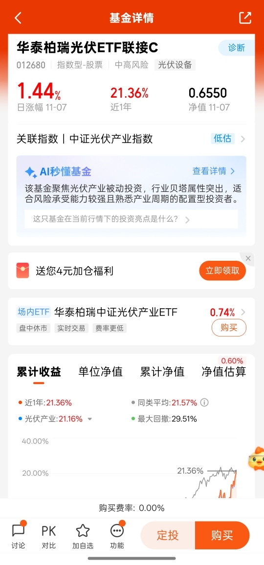 今天打开行情软件,光伏板块真是肉眼可见的回暖!不少龙头股稳步上涨,成交量也跟着放大,完全不是短期炒作,而是行业真的变好了。之前大家拼低价抢订单的内卷乱象,现在被政策狠狠规范了,不符合要求的小企业被清出去,优质产能留在市场里,供需慢慢平衡了。加上硅料价格回升,三季度好多企业都从亏损转盈利,基本面彻底改善。我这种怕踩雷的普通投资者,果断选了华泰柏瑞的产品,一键打包优质企业,不用自己选股。而且C类没申购费,持有满7天赎回也免费,闲钱投进去跟着行业复苏走,比瞎买个股踏实多了~