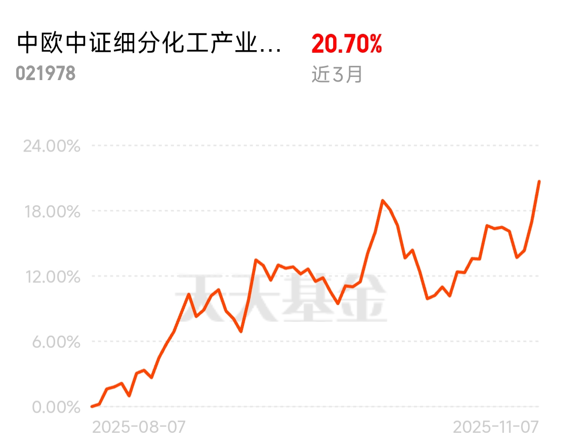 现在追科技热点的都怕了,轮动太快抓不住,化工行业反而走势稳健。原料涨价、下游需求回升,估值也舒服,中欧中证细分化工产业主题指数C近3个月涨20.70%,重仓优质企业,拿住就安心。