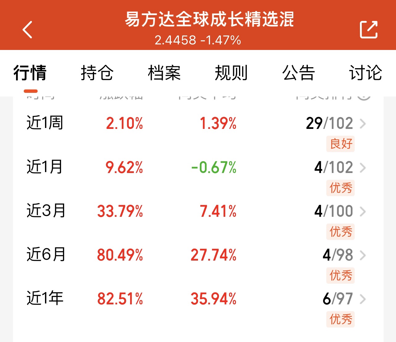 易方达全球成长精选混合(QDII)C是一只真正能“跑得稳、抓得准”的全球配置基金。同类榜单长期稳居第一,走势不仅比竞品更强、更顺滑,回撤控制也堪称优秀。背后核心在于基金经理的精准预判与灵活调仓能力:一季报果断加仓港股,提前卡位估值修复;二季报转向美股AI算力主线,踩中产业脉搏;而在近期美股大跌时,又迅速控回撤、守住收益。